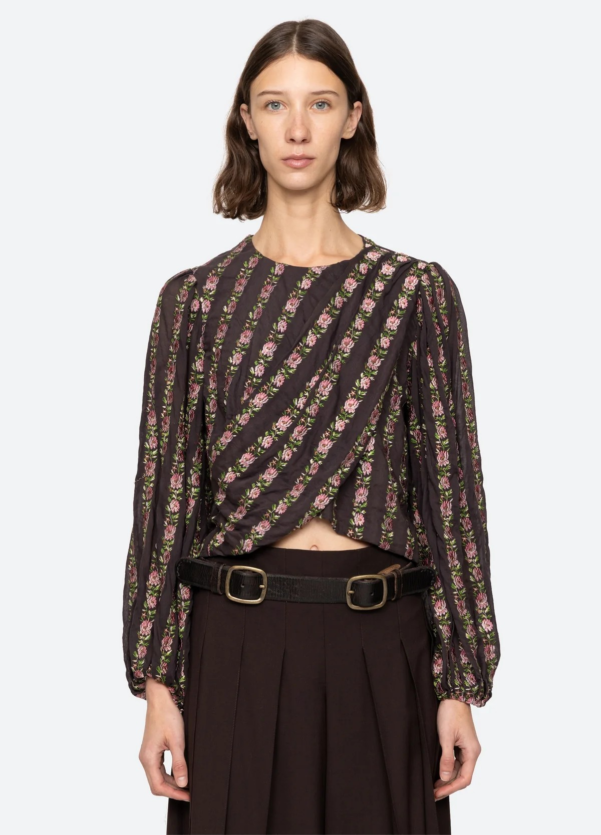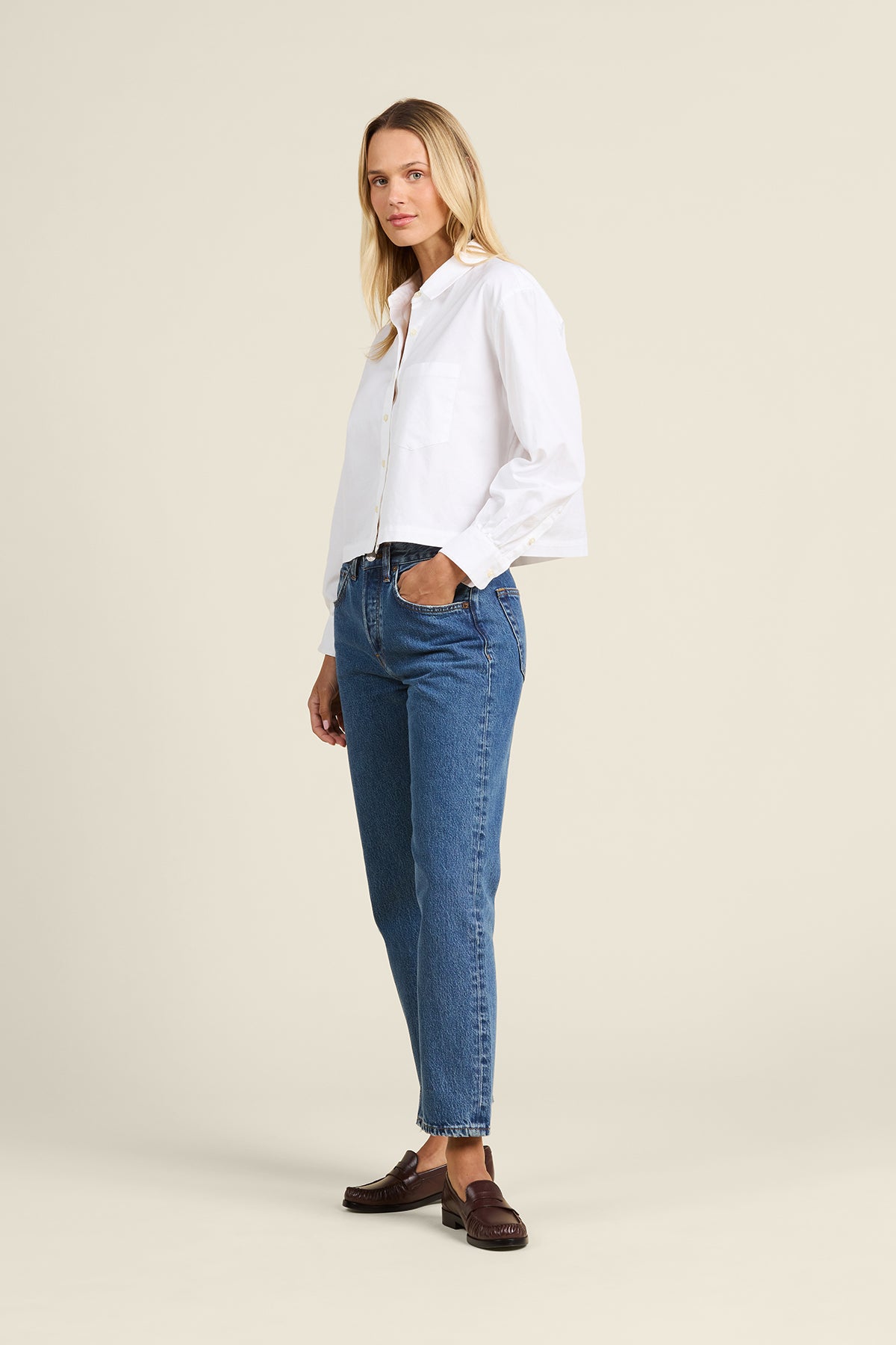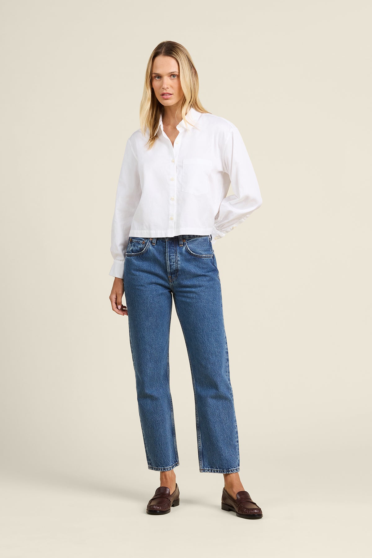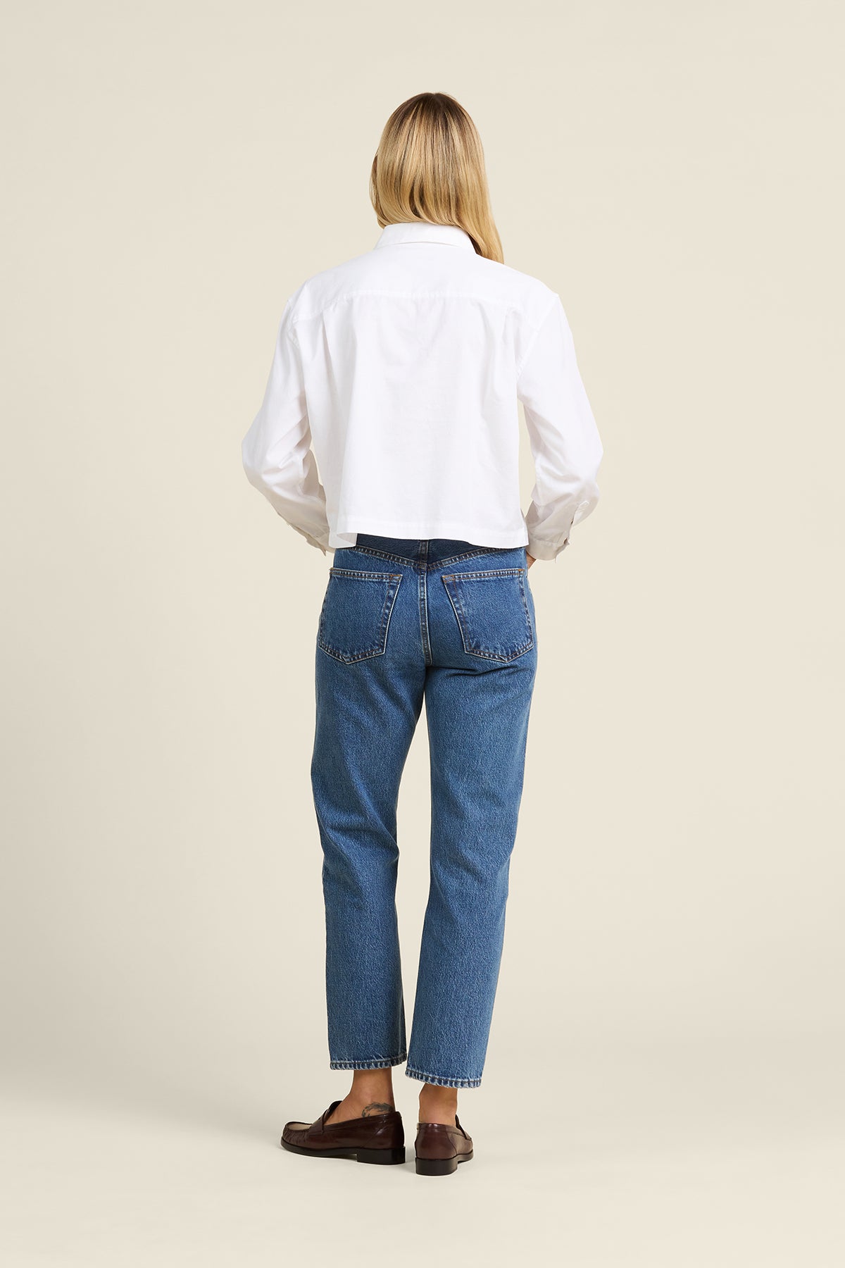 This shirt has a slightly oversized fit, with a crop that sits at the belt line, and is completed with antique white buttons and a single chest pocket.