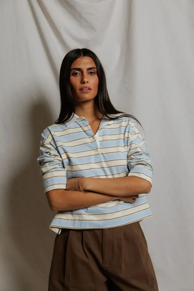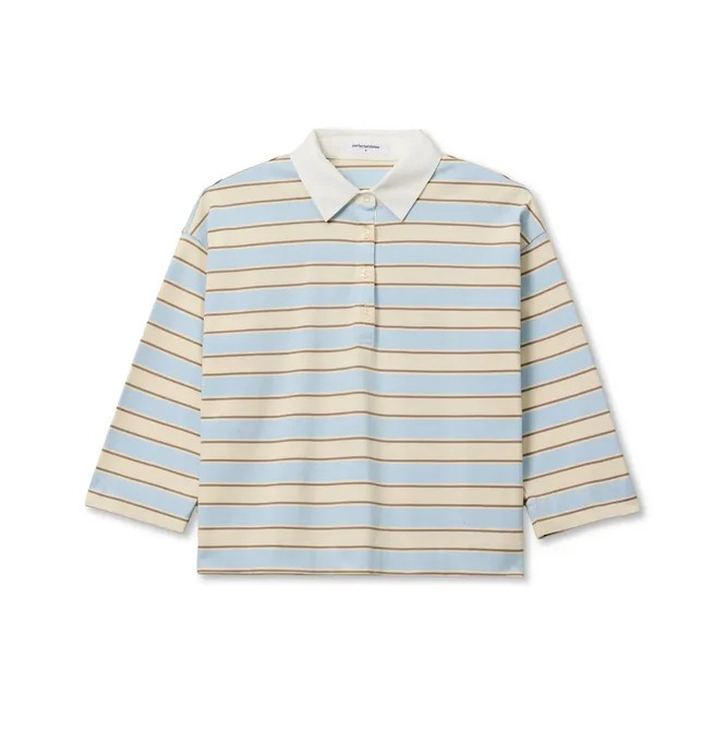 It’s a structured cotton collared rugby shirt featuring a clean button placket and a relaxed, slightly cropped silhouette that feels modern and feminine in vintage-inspired striped colors of the season. i